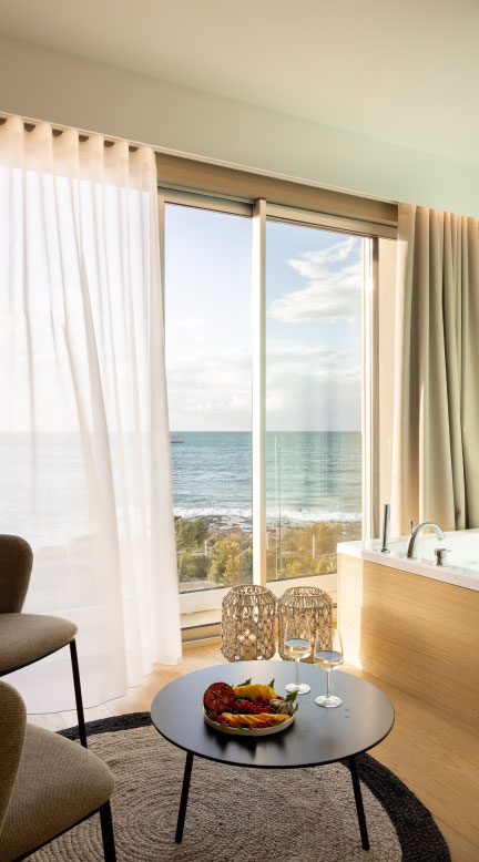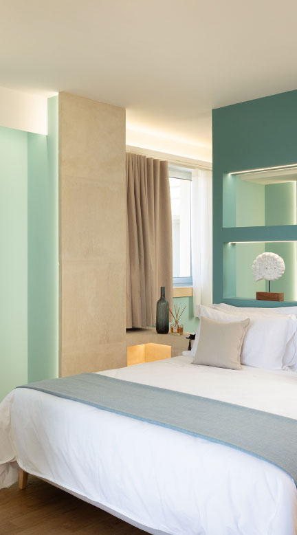 Le ampie vetrate dissolvono ogni confine tra te e l’orizzonte, lasciando che la luce e la brezza marina danzino nella stanza. La spaziosa camera Deluxe Acquamarina non è solo un luogo dove soggiornare, ma un’esperienza che vibra nell’anima, un’emozione che si assapora, si porta con se.