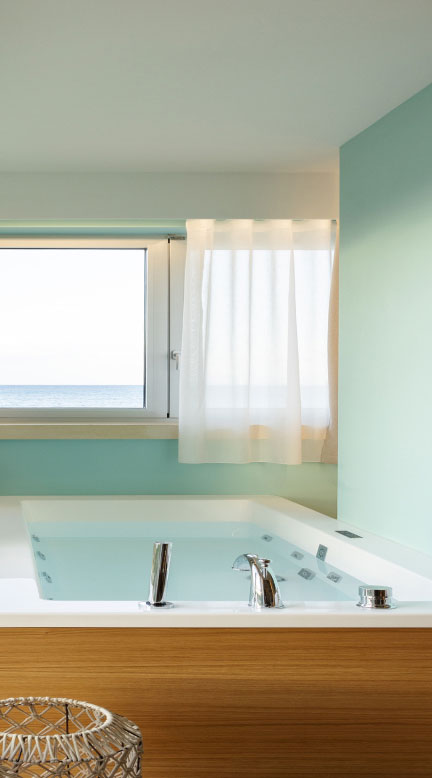 il tempo rallenta e i sensi si risvegliano. Immagina di immergerti nella vasca fronte mare, l’acqua tiepida che accarezza la pelle mentre i sali da bagno diffondono fragranze rilassanti. Fuori, l’orizzonte si tinge d’oro e porpora, il mare canta la sua melodia eterna, il vento porta con sé il profumo della macchia mediterranea…