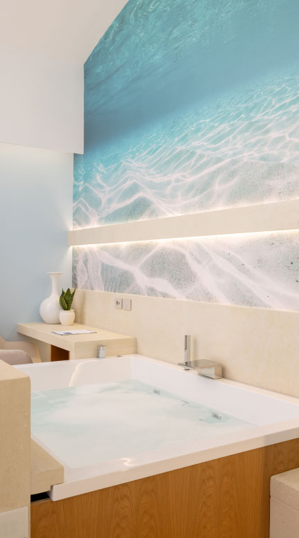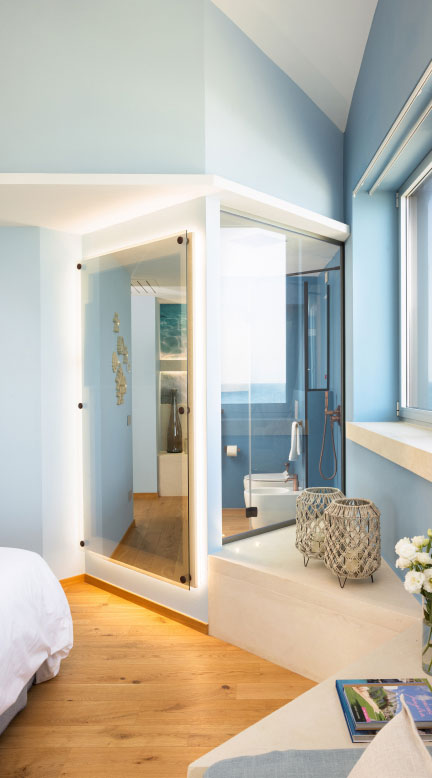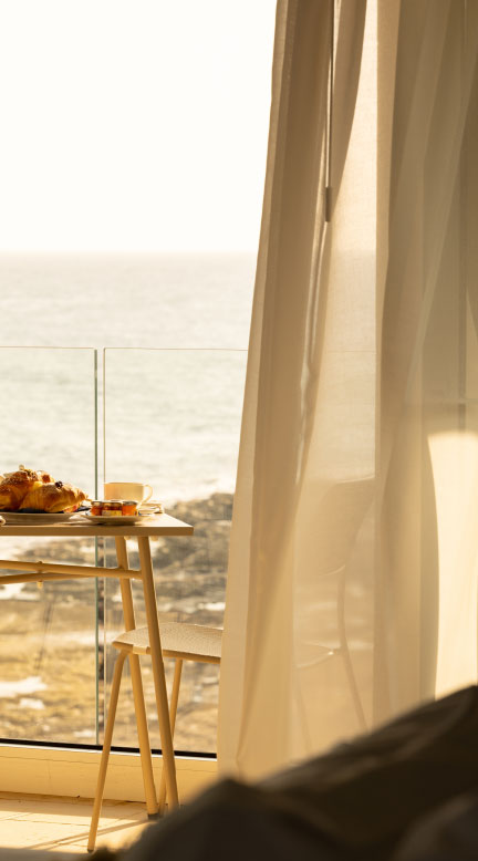 Stare nella Junior Suite Pietra Marina è come affacciarsi dalla prua di una nave, il confine tra sogno e realtà si dissolve e il mare si fa presenza viva, avvolgente, in ogni istante. Le ampie vetrate catturano la luce del giorno e i riflessi lunari, mentre il balcone spalanca lo sguardo sull’infinito, regalando la suggestione di navigare in una crociera tra cielo e onde.