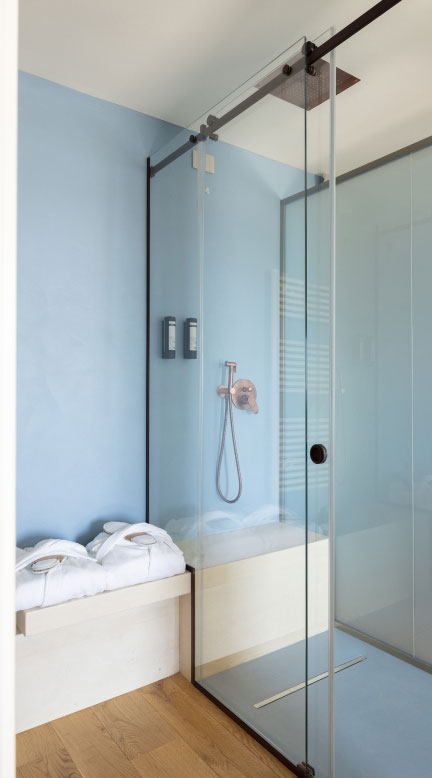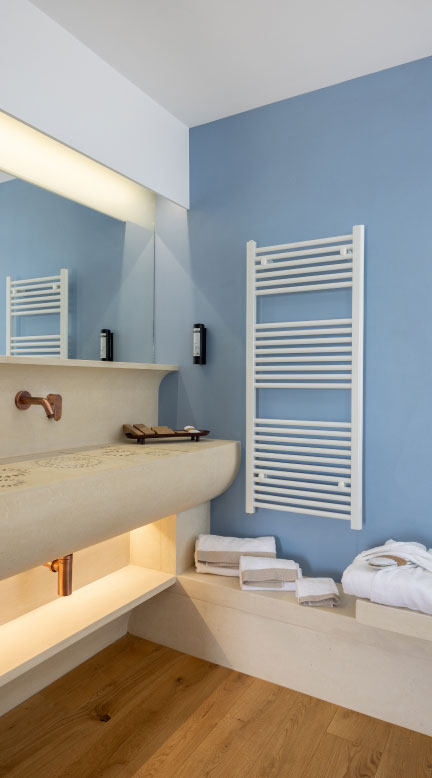 The largest suite at Metamare, it unfolds into an elegant sleeping area and a sophisticated living space, featuring a plush sofa that invites you to unwind. The bathroom, a true masterpiece of design and harmony, is arranged into two spaces, separated by a scenic open-view shower, where water’s rhythm merges with light dances and shapes every moment into a ritual of pure well-being.